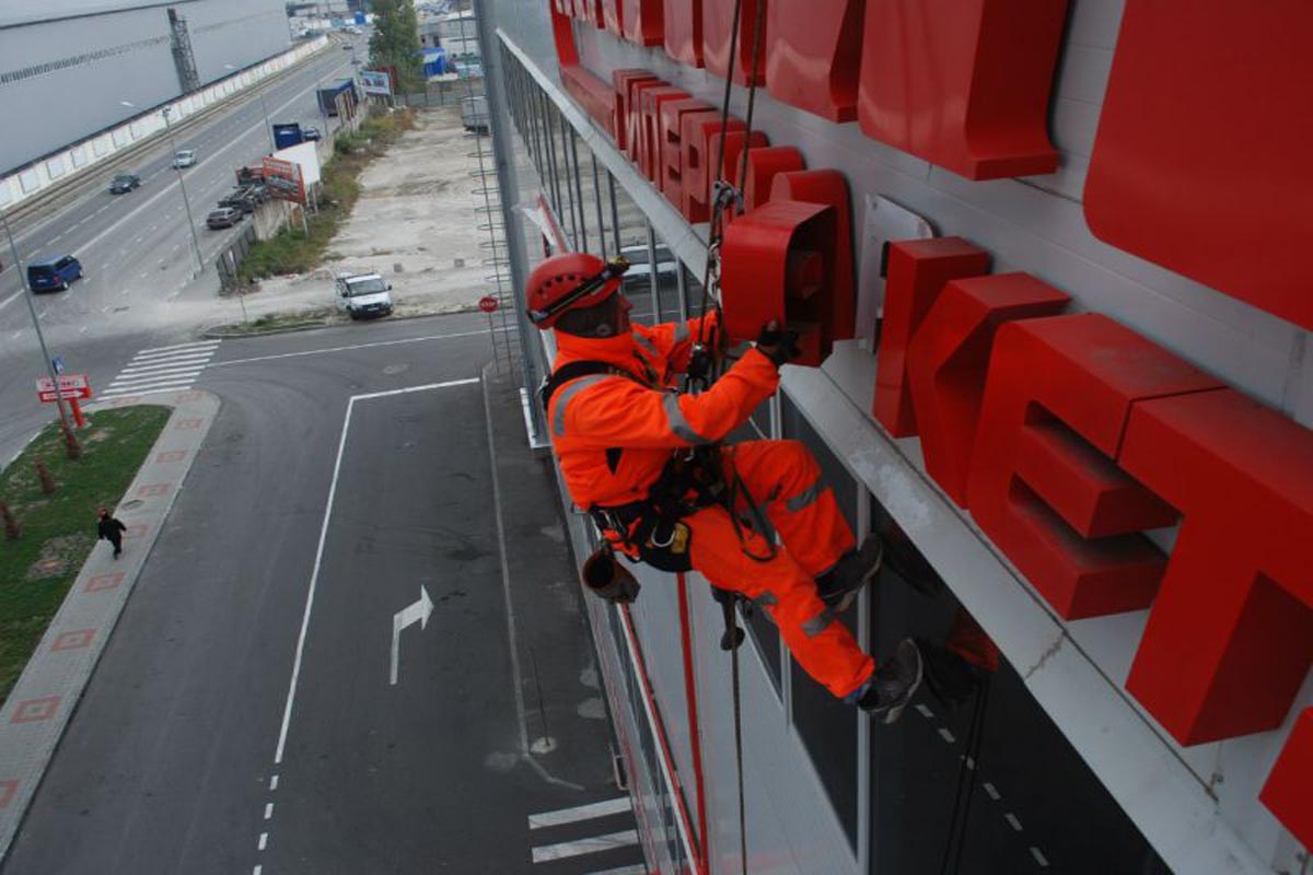 Промышленный альпинизм – специальная технология выполнения работ на высоте с использованием альпинистских методов доступа и страховки. Применительно к рекламной сфере под промышленным альпинизмом понимаются работы, выполняемые на высоте специалистами с использованием специальной техники с целью монтажа, демонтажа или обслуживания конструкций наружной рекламы.