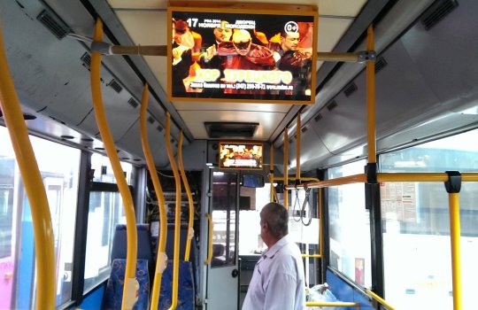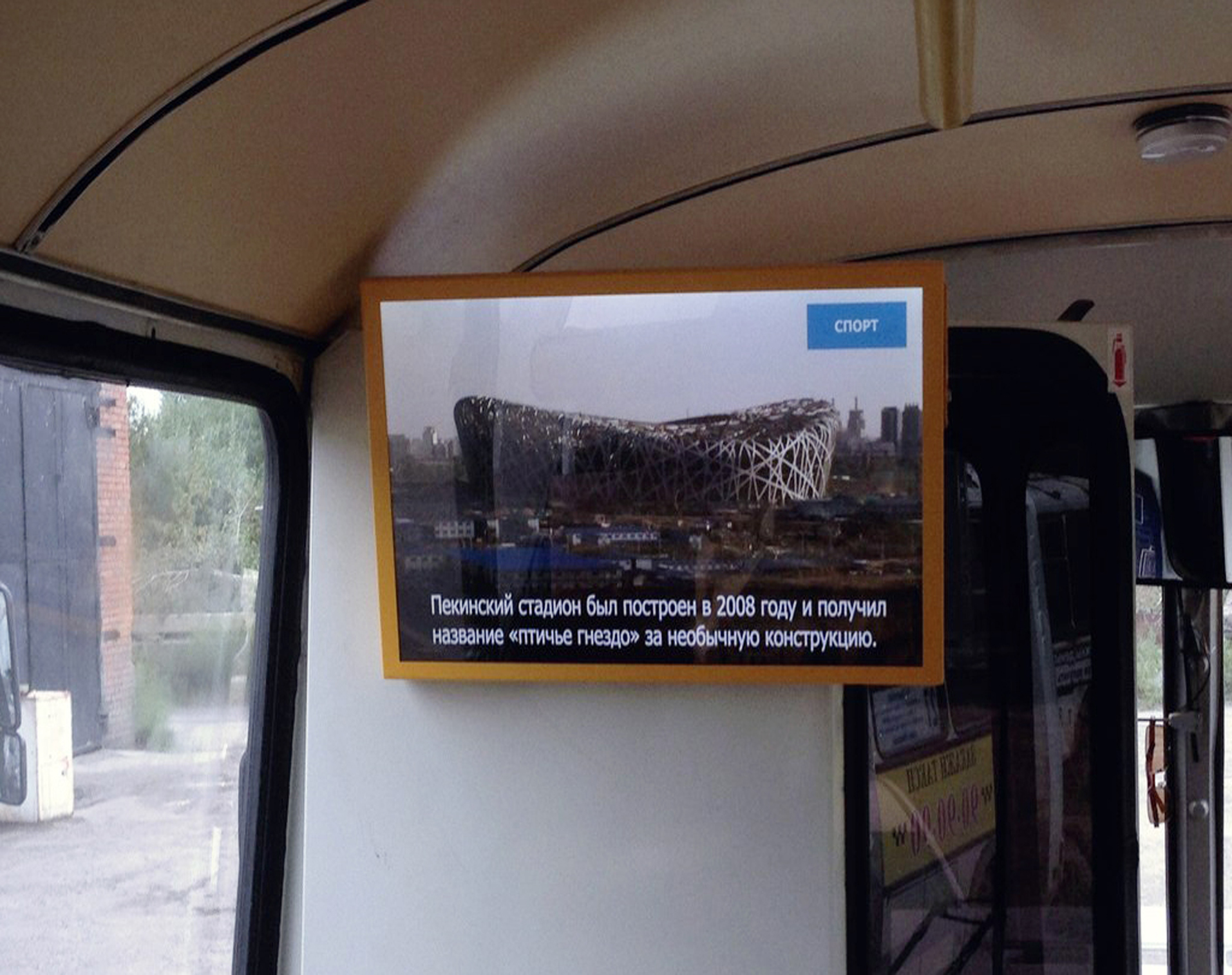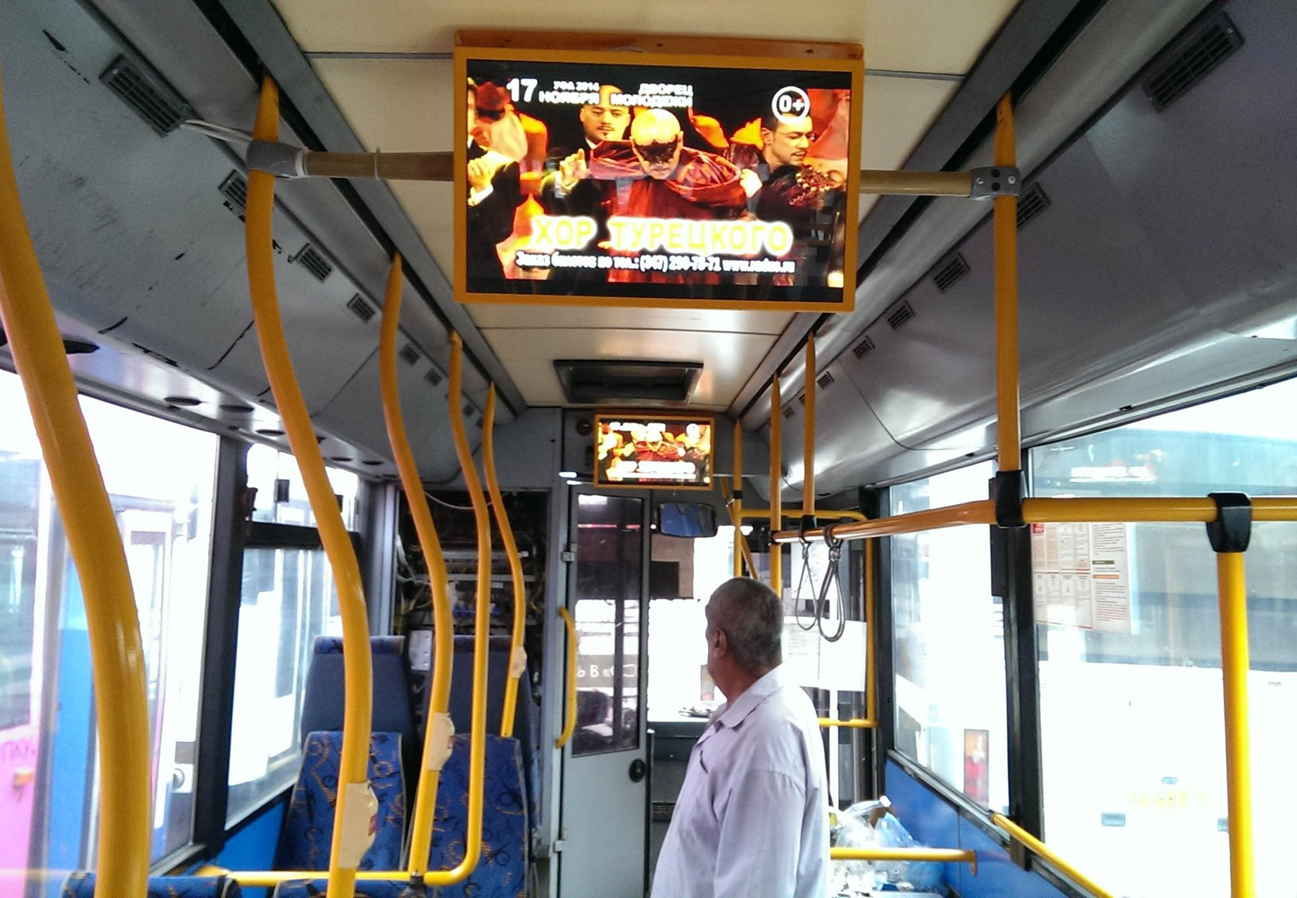 Напомним, что рекламу в автобусах в Александрове можно разместить как в виде стикера, афиши, бортовой оклейки, так и запустить трансляцию рекламного ролика на установленных в салоне транспортного средства мониторах.