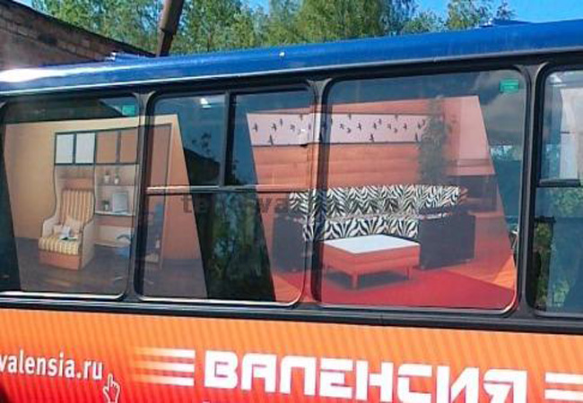 Пример брендирования стекол автобуса перфорированной пленкой: