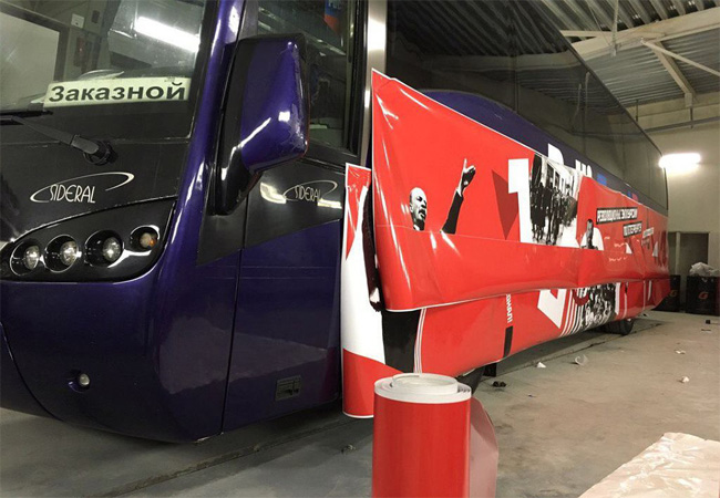 3) процесс брендирования (оклейки) автобуса рекламой: