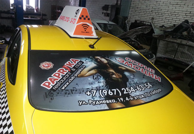 Оклейка заднего стекла такси на фото выше