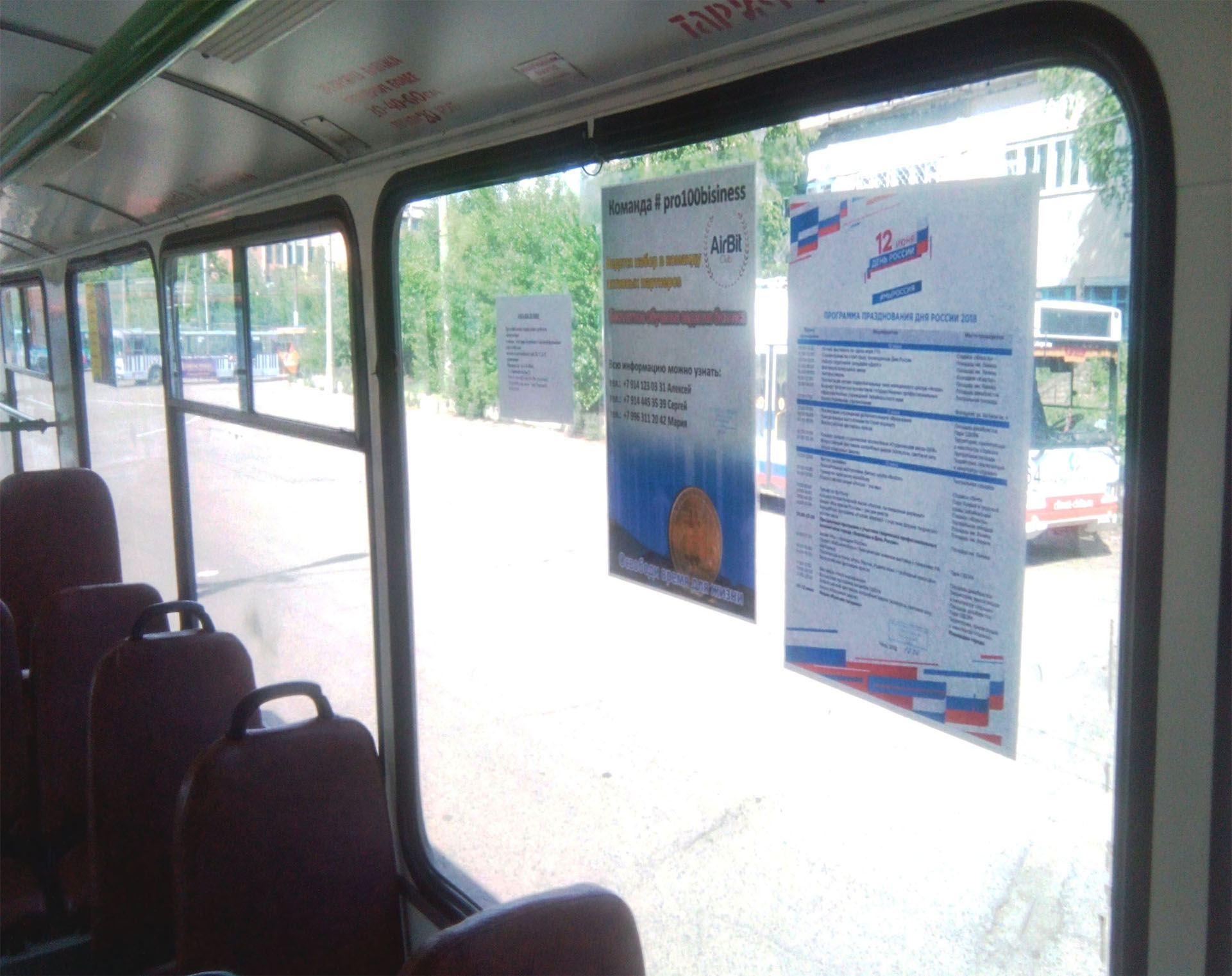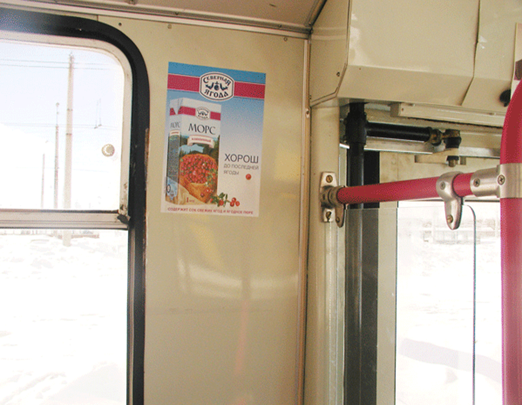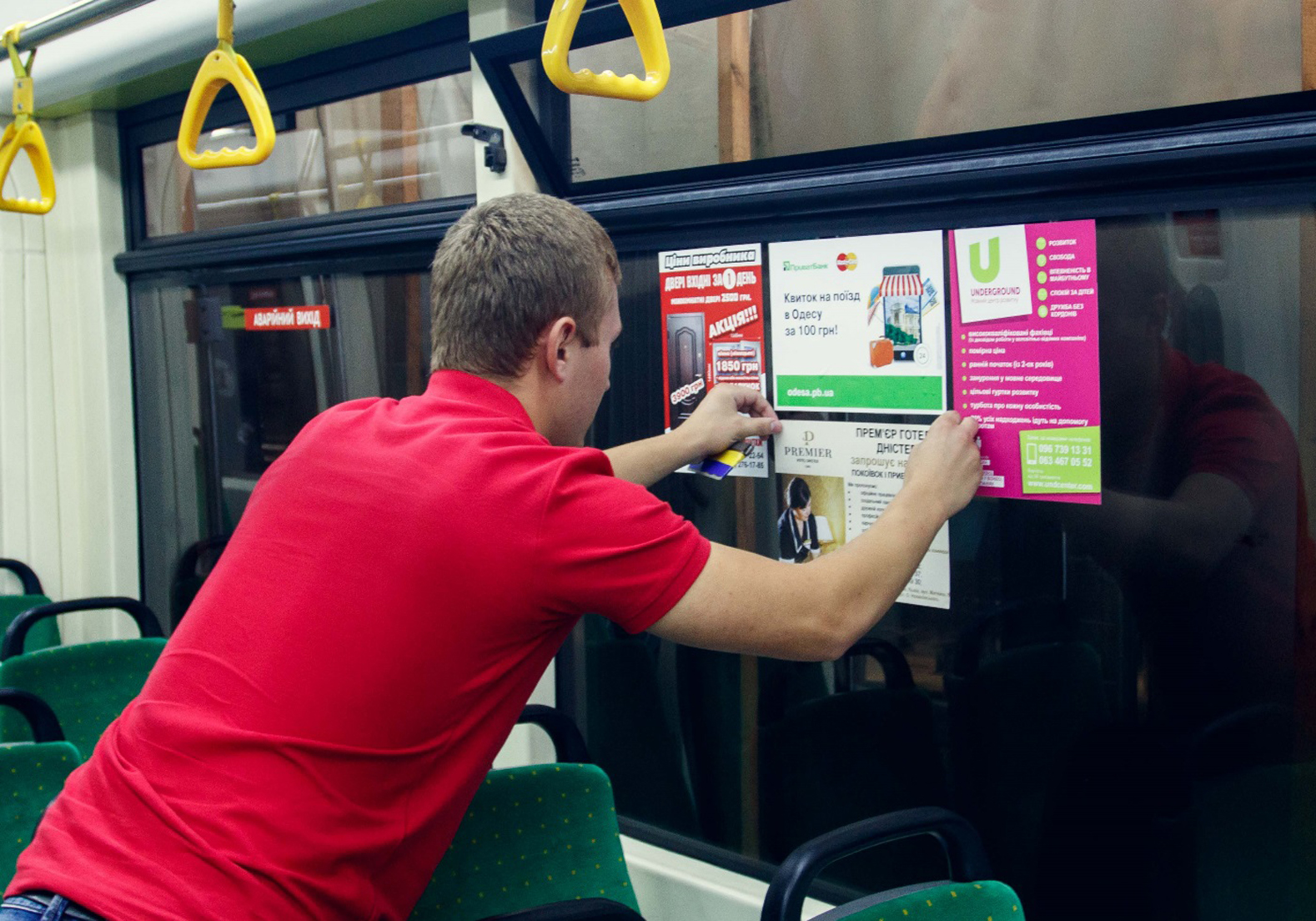 Монтаж рекламы в трамваях осуществляется по-разному в зависимости от того, какой рекламный материал и где размещается.