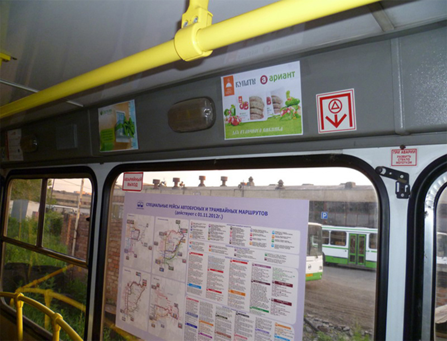 Ежедневно, заходя в общественный транспорт, пассажиры сталкиваются с рекламными листовками различных форматов. Водители, пешеходы, проезжая или проходя мимо транспортного средства, наблюдают рекламу, размещенную на бортах, стеклах транспортных средств. Особо необходимо отметить, что один и тот же человек может встретиться с рекламой, размещенной на трамваях, несколько раз в день. Таким образом, частота контактов потенциальных клиентов с рекламой, размещенной на трамваях, находится на очень высоком уровне.