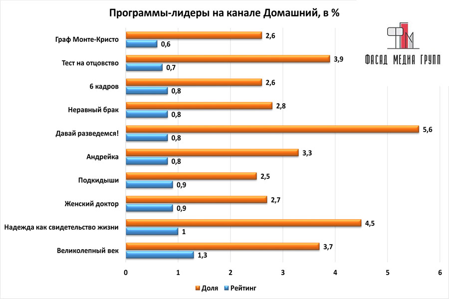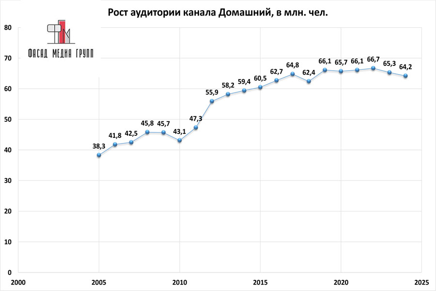 Популярность телеэфира на «Домашнем» приводит к ежегодному увеличению спроса на рекламное время. Для привлечения клиентов из разных регионов России, увеличения процента продаж, повышения имиджа компании и узнаваемости бренда – размещайте рекламу на «Домашнем». «Домашний» – это проверенный и востребованный канал для размещения рекламы на александровском ТВ. Для размещения рекламы на телевидении обращайтесь в рекламное агентство «Фасад Медиа Групп». Будем рады сотрудничеству.