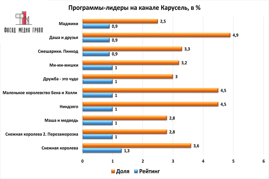 Популярность телеэфира на «Карусели» приводит к ежегодному увеличению спроса на рекламное время. Для привлечения клиентов из разных регионов России, увеличения процента продаж, повышения имиджа компании и узнаваемости бренда – размещайте рекламу на «Карусели». «Карусель» – это проверенный и востребованный канал для размещения рекламы на александровском ТВ. Для размещения рекламы на телевидении обращайтесь в рекламное агентство «Фасад Медиа Групп». Будем рады сотрудничеству.
