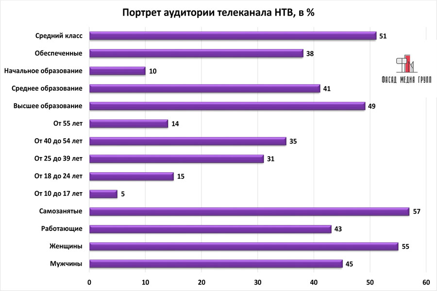 В процентном соотношении аудитория «НТВ» выглядит так: