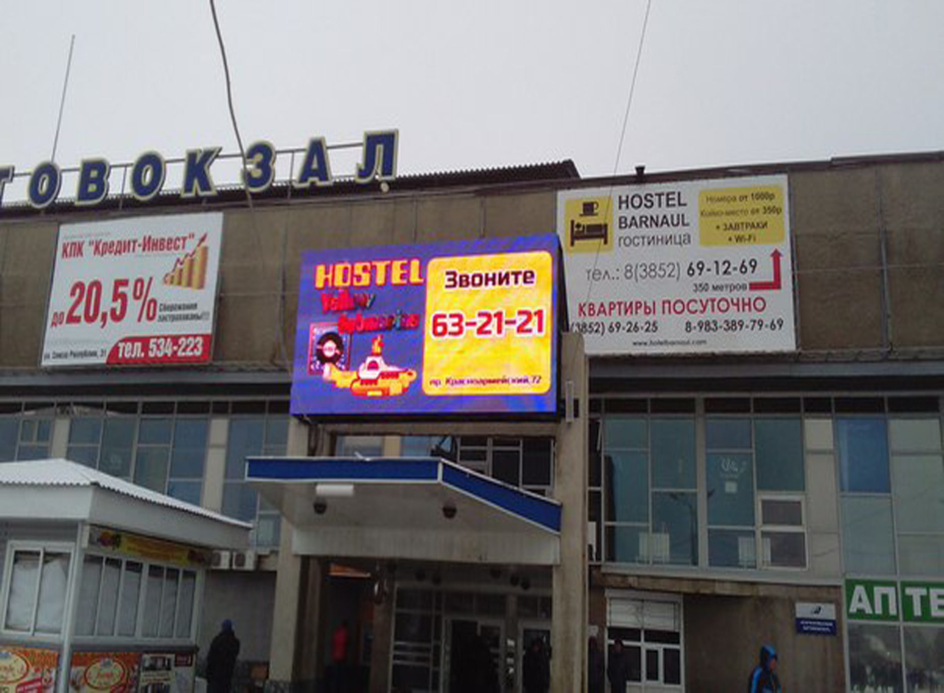 Пример рекламы на видеоэкране возле здания автовокзале: