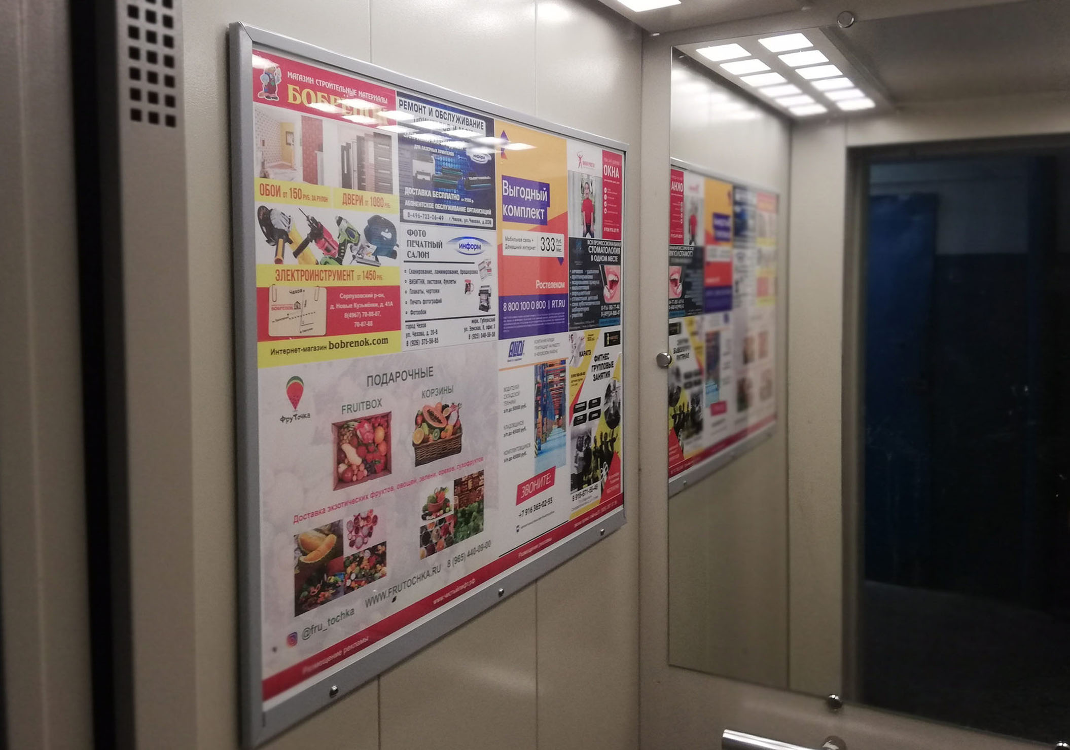 Монтаж рекламы в лифтах осуществляется по-разному в зависимости от того, какой рекламный материал размещается.