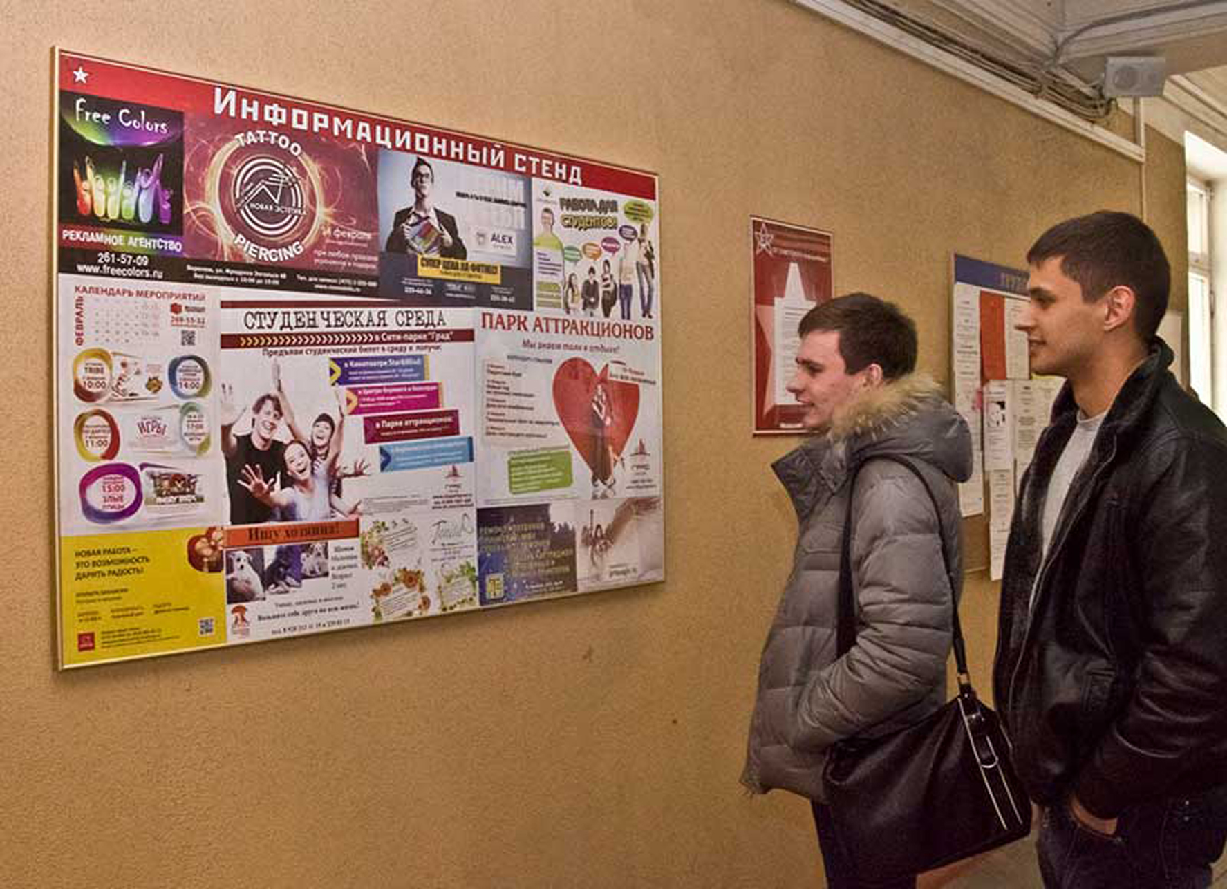 Реклама в ВУЗах отличается тем, что рекламные материалы располагаются на уровне глаз потенциального клиента или покупателя. Удачное расположение рекламы приводит к тому, что листовки, буклеты и другие форматы рекламы в ВУЗах (институтах, университетах, академиях и т.д.) хорошо видны и обеспечивают 100% читаемость со стороны посетителей.